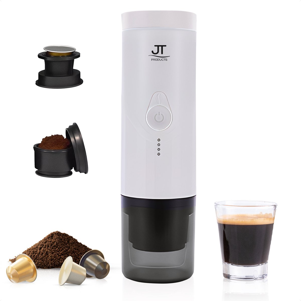 JT Products Draagbare Espressomachine to Go – 2 in 1 Koffiecup of Gemalen Koffie – 2 Kleuren – Elektrisch